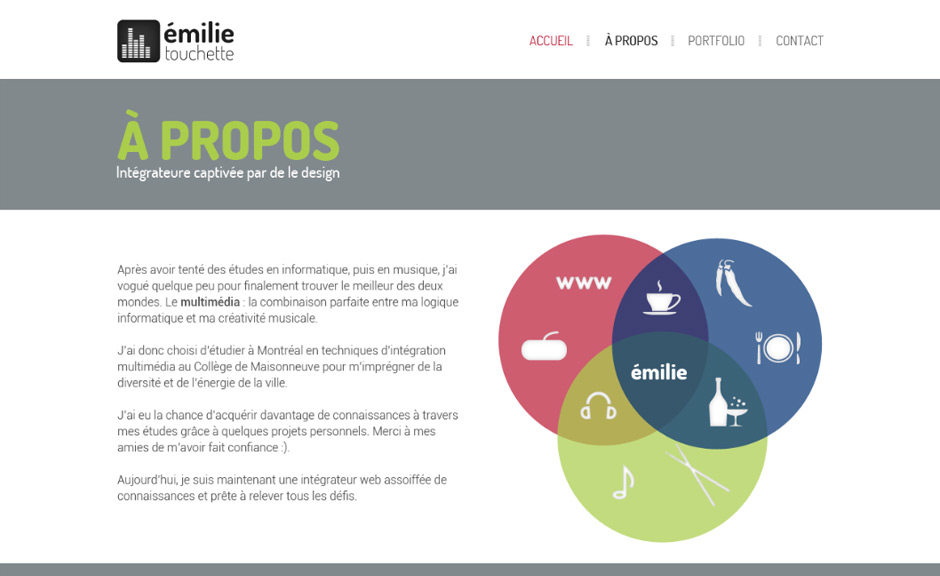 À travers la création de mon portfolio, j'ai eu la chance d'utiliser pour la première fois deux frameworks soient Skeleton pour le CSS et CodeIgniter pour la programmation serveur. J'ai également découvert le design et l'intégration sur plusieurs résolutions à l'aide des medias queries. Bien que ce n'était pas un de mes objectifs principaux, le site s'affiche aussi convenablement sur mobile.